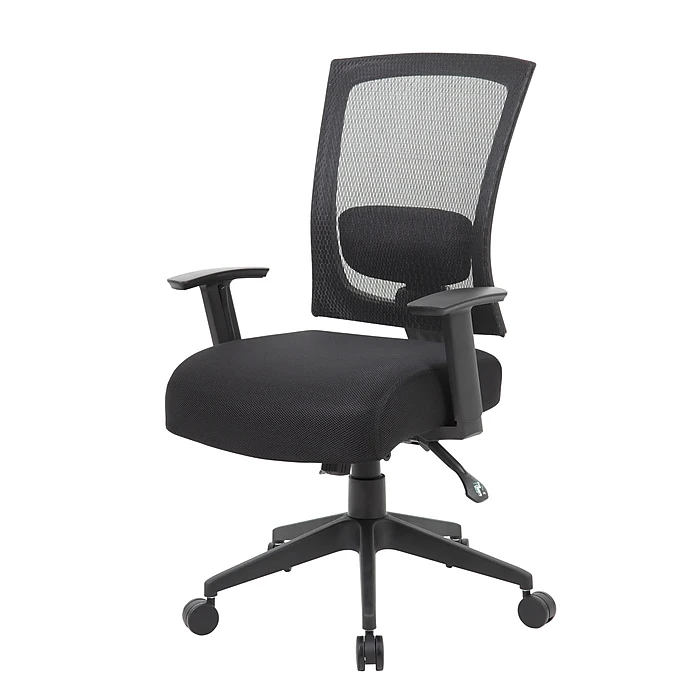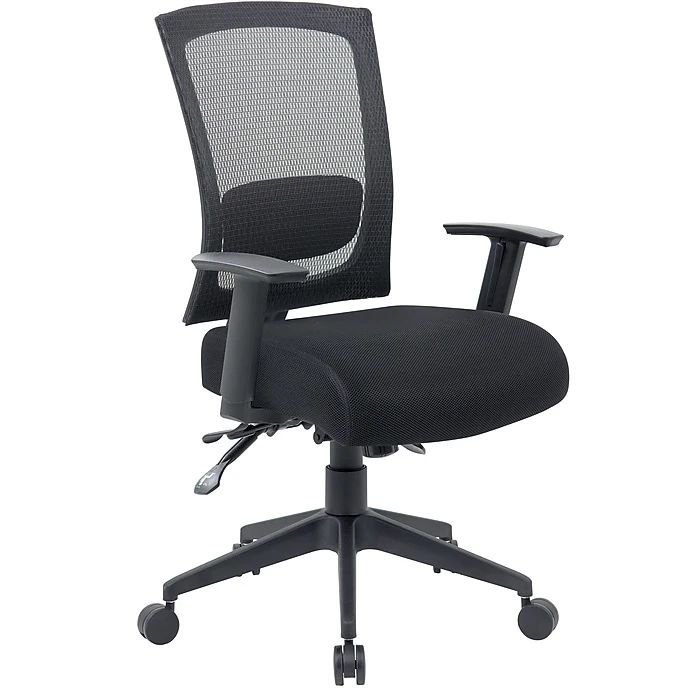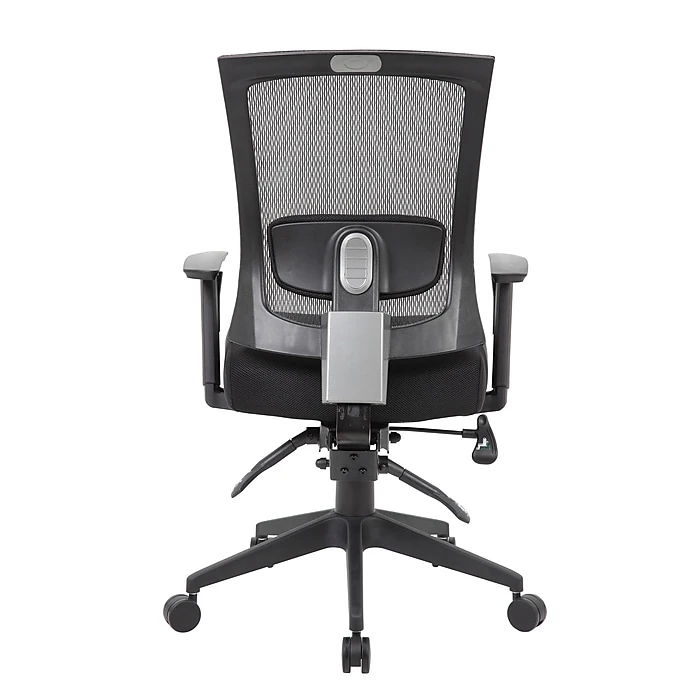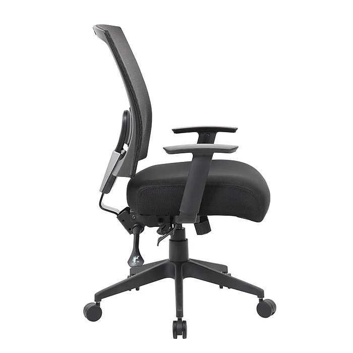 This multi-function task chair is perfect for any office environment. It features a mesh back with lumbar support, ratchet back height adjustment, and adjustable tilt tension control. Its 3 paddle multi-function tilting mechanism allows for easy adjustment and locks in any position for maximum comfort. There’s also a new SereneSoft seat with pneumatic gas lift seat height adjustment, horizontal mesh back, and mesh arm pads attached to adjustable height armrests. All of this is supported by a 25-inch black nylon high crown base with hooded double wheel casters.