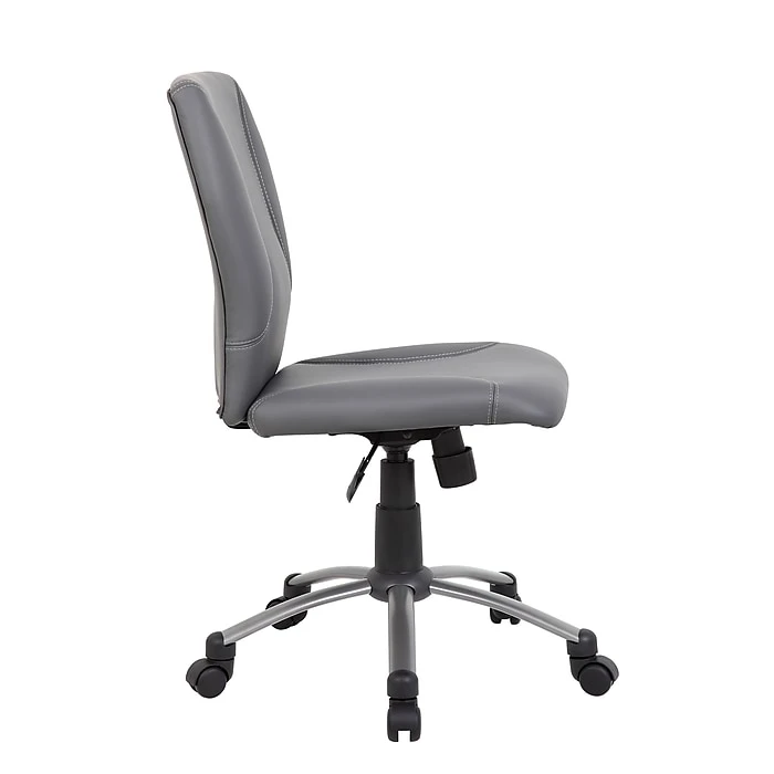 This Tiffany Task Chair is beautifully upholstered in grey CaressoftPlus with double stitching back and seat. It has an elegant and stable Pewter finished base. This contemporary task chair allows for upright locking positions, providing personalized back support for your individual needs. It also provides adjustable tilt tension control, allowing you to customize the optimal angle at which you sit. It has a pneumatic gas lift seat height adjustment, allowing for versatile adjustment of the seat height to suit your comfort and work environment. The hooded double wheel casters make it easy to move and shift directions.