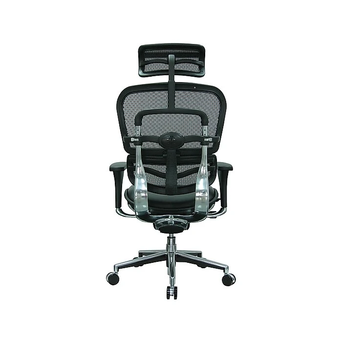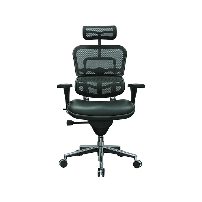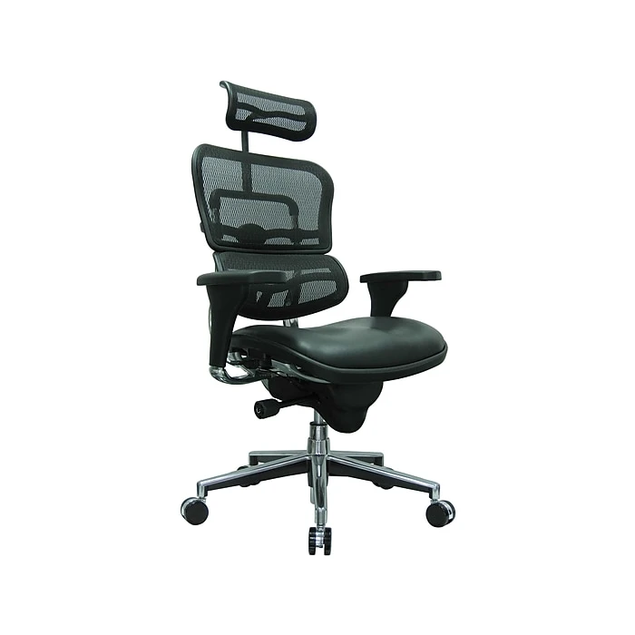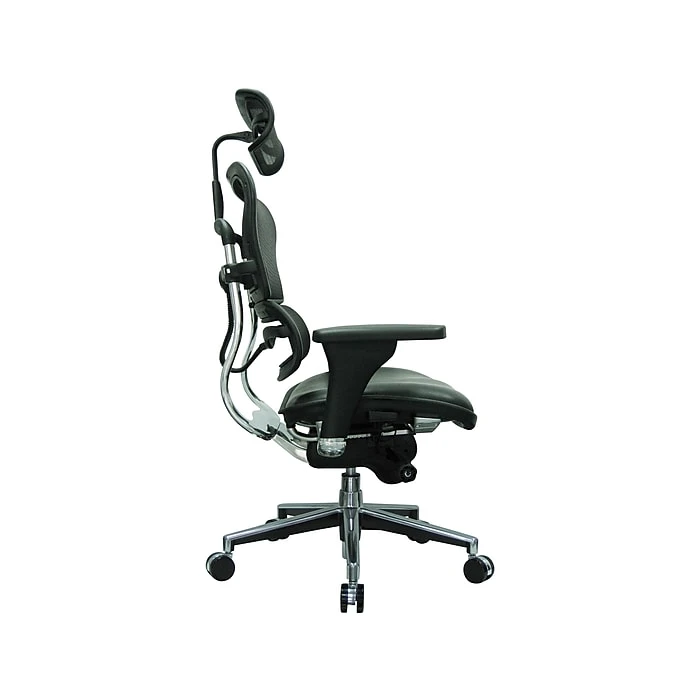 Manage business with this fully customizable Eurotech Ergohuman leather executive office chair with adjustable arms. With a full array of adjustable components for back height, seat depth and arm height, this executive seating option provides tailored support for your entire upper body. The high-back design also features built-in lumbar support, while the mesh fabric helps keep you cool. Reclining is amply facilitated with the total tilt control with tilt tension, tilt lock and synchro-tilt for a completely personalized fit. The plush leather seat has a waterfall edge to promote leg circulation for extra relief throughout the business day. Lean back and relax your neck and shoulders with the adjustable single-lever headrest. This Eurotech Ergohuman leather executive office chair with adjustable arms offers extra custom tailoring with both seat depth and seat height adjustments.