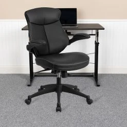 Tackle your most important work comfortably with this Flash Furniture high-back executive chair. The fixed arms feature a sloped design to support your shoulders, arms and hands, while the contoured seat and back come with plush padding for added cushion. Durable fabric upholstery lends a modern look to this chair while also withstanding everyday wear and tear. Featuring a swivel seat and dual-wheel casters, this chair lets you move freely about the office. Find the perfect height for your seat with the pneumatic height adjustment feature, and recline into a more relaxed position with the tilt tension control. With built-in lumbar support, this Flash Furniture high-back executive chair helps relieve stress and strain on tired back muscles.