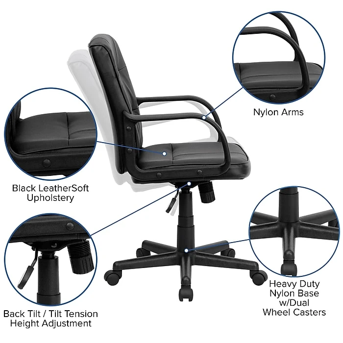 Power through long workdays with this Flash Furniture LeatherSoft fixed-arm office chair. The mid-back design with segmented cushions offers added support for tired, sore backs, and the curved armrests slope forward to keep your arms in a comfortable position. A tilt/tension control knob lets you find the ideal angle for reclining, while the tilt/tension lock prevents the seat back from tipping. Use the pneumatic seat height adjustment feature to position this chair at the right level for your desk and enjoy 360-degree swivel action when you want to transition from one task to another. Luxurious upholstery crafted from leather and polyurethane gives this Flash Furniture LeatherSoft fixed-arm office chair an upscale look and inviting texture.