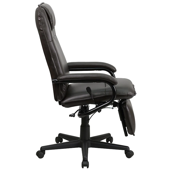 Easy CustomizationThis Flash Furniture black recliner chair allows the user to lay back at the press of a lever. In addition, it also allows the user to adjust the height of the chair up to four inches as well as recline the chair to his or her liking. The Flash Furniture high back executive office chair in brown also includes five twin-wheels that work well on both carpet and wood floors for added mobility.Eco-FriendlyThe materials and labor used to build this chair reach or exceed the ANSI/BIFMA furniture standards for sustainability. This ensures the chair was made with eco-friendly materials and energy usage during the manufacturing process was minimized.Promotes Good PostureThis office chair also includes excellent lower back and spine support, amongst other comfort features. The lower back and lumbar support that the Flash Furniture high back office chair features, targets the lower spine and keeps y our abdominals, back, and neck in a proper, healthy position all day long. In addition, the headrest also helps keep the user’s head in good position.