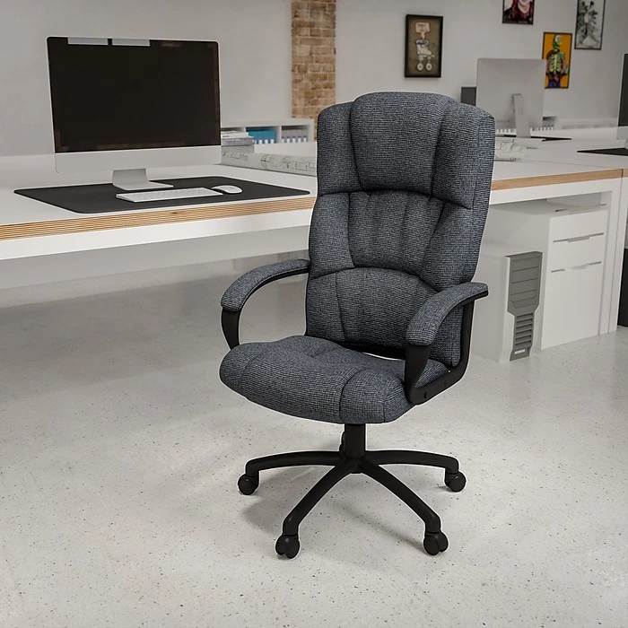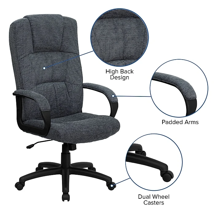 Modern LooksThe Flash Furniture fabric executive chair features a contrasting gray upholstery with a textured pattern that’s easy to maintain, and its deep tone is ideal for many different professional environments. Stitched detai ls on the back highlight support areas and create a contemporary look.ComfortThis Flash Furniture high-back executive chair is tall enough to support the entire back as well as the neck and head, and padding over the a rmrests offer a soft place to relax the forearms. This gray ergonomic executive chair swivels and tilts back to give users optimal mobility, and a powerful pneumatic mechanism raises or lowers the seat to the height that’s ideal for each worker.