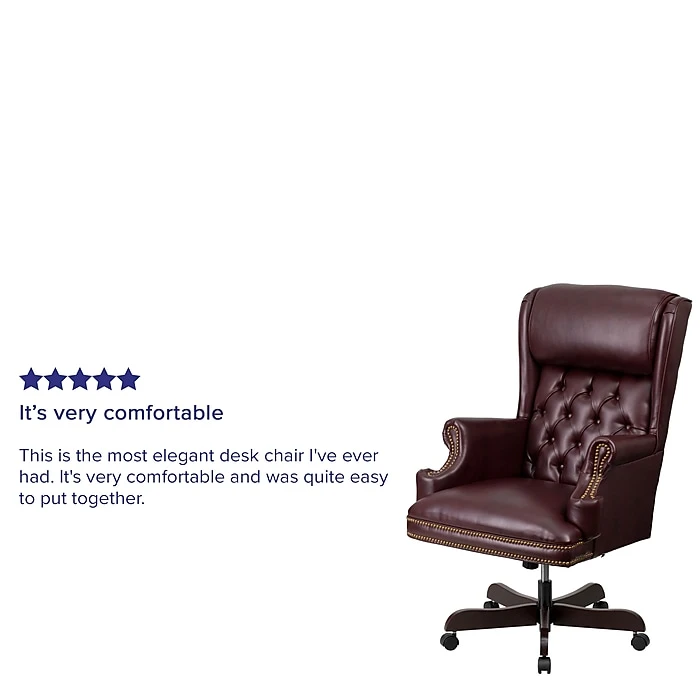 The Flash Furniture Traditional Executive Chair in an attractive burgundy shade blends with any decor and will be the perfect addition to your office space. Furnished with high-quality leather upholstery, this high-back executive chair adds a fresh look to your workspace. Its pneumatic seat height adjustment mechanism lets you regulate the seat height to achieve a good sitting position. This chair has a tilt function that allows you to recline while reading or working. Thanks to the swivel function, the chair can rotate in all directions.