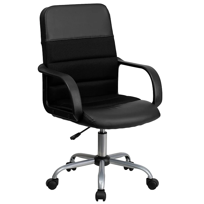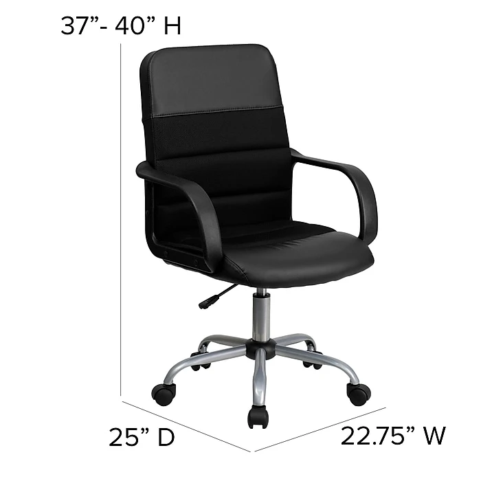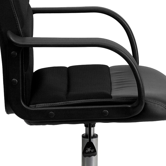 Sit comfortably as you type emails or meet with clients in this Flash Furniture LeatherSoft office chair. The mid-back design offers added support for your frame, while segmented padding provides added cushion for long hours at the office. The mesh upholstery lets air circulate to keep you cooler throughout the day. With luxurious LeatherSoft appointments, this desk chair brings modern style to your workspace. Use the dual-wheel casters to roll from one corner of your office to the other and put the swivel seat to work when you need to transition from the computer to a client meeting. This Flash Furniture LeatherSoft office chair comes with a pneumatic seat height adjustment lever, so you can customize the setup to fit your personal preferences.