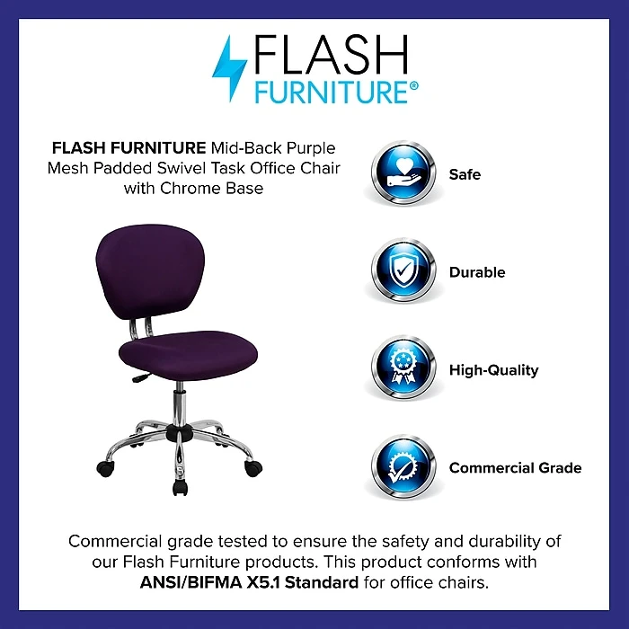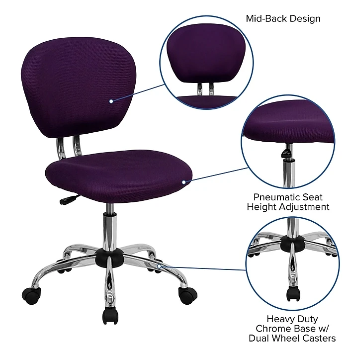Long working hours are a breeze with this purple Flash Furniture Contemporary Task Chair that guarantees comfort and support. For extra softness and cushioning, this mid-back task chair has high-quality mesh upholstery. Its pneumatic seat height adjustment mechanism lets you alter the height to attain a comfortable posture. This task chair has 2-inch thick padded mesh seat and breathable mesh backrest for maximum comfort. It is made of fire-retardant foam that makes it an ideal choice in order to minimize the danger in case of extreme situations.