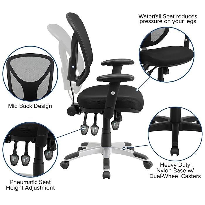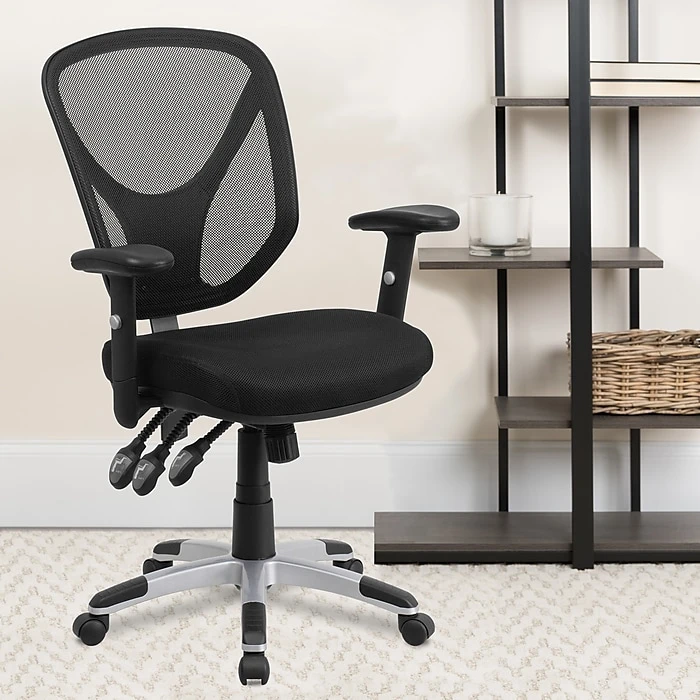 If you’re looking for an easy to adjust office chair than this triple paddle chair is an excellent choice. Mesh office chairs can keep you more productive throughout your work day with its comfort and ventilated design. The contoured seat dissipates pressure points for greater comfort. The mid-back design offers support to the mid-to-upper back region. The locking back angle adjustment lever changes the angle of your torso to reduce disc pressure. The locking tilt mechanism allows you to lock your cha ir in a comfortable work position. The waterfall front seat edge removes pressure from the lower legs and improves circulation. Chair easily swivels 360 degrees to get the maximum use of your workspace without strain. The pneumatic adjustment lever will allow you to easily adjust the seat to your desired height. The adjustable armrests take the pressure off the shoulders and the neck, which minimizes the risk of pain. This comfortably designed computer chair will make a great option for your home or o ffice space.