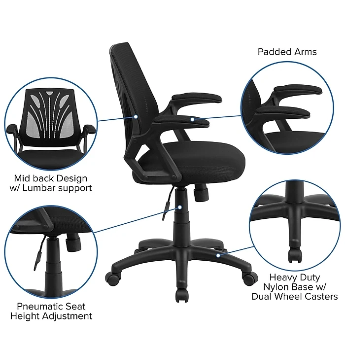 Mesh office chairs can keep you more productive throughout your work day with its comfort and ventilated design. The breathable mesh material allows air to circulate to keep you cool while sitting. The mid-back design offers support to the mid-to-upper back region. From behind the desk to the meeting room this chair can provide a seamless addition to your work space. The waterfall front seat edge removes pressure from the lower legs and improves circulation. Chair easily swivels 360 degrees to get the maximum use of your workspace without strain. The pneumatic adjustment lever will allow you to easily adjust the seat to your desired height.