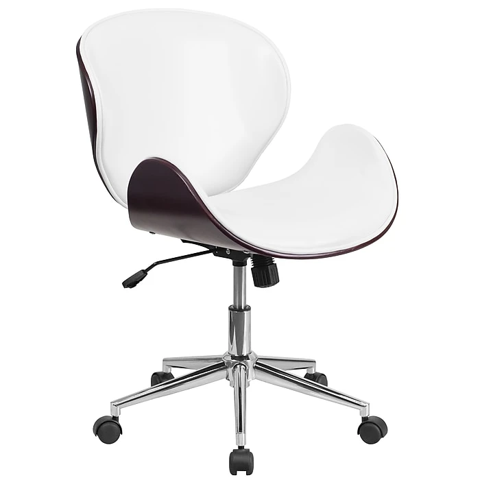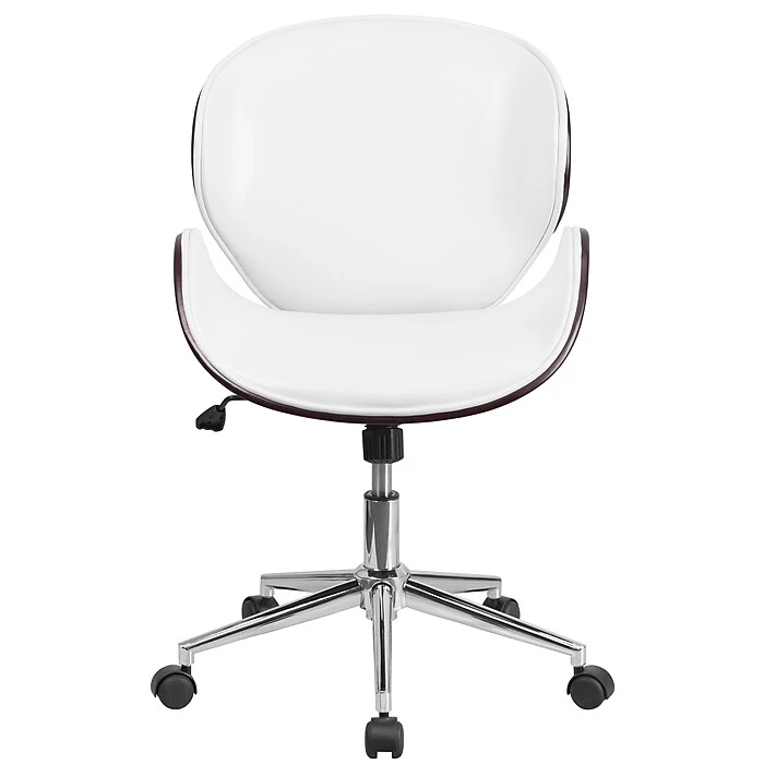 This office chair features a beautiful mahogany bentwood frame with glossy white leather upholstery. This chair is sure to make an impression and become the focal point in your office or home office. A mid-back office chair offers support to the mid-to- upper back region. The contoured backrest provides firm back support. Chair easily swivels 360 degrees to get the maximum use of your workspace without strain. The pneumatic adjustment lever will allow you to easily adjust the seat to your desired heigh t.