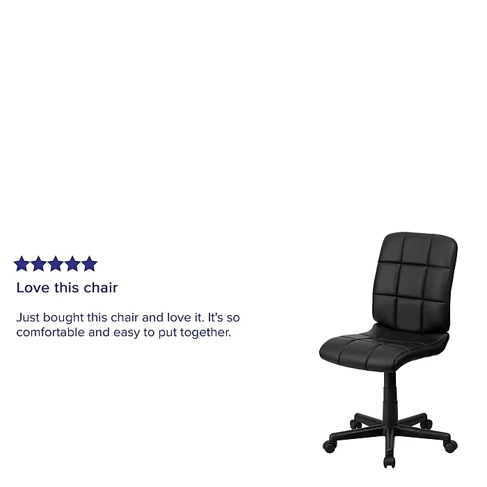 Complete your home office, computer terminal or reception desk with this Flash Furniture office chair. The armless design makes it easy to get in and out of the seat, while the simple silhouette offers a clean, modern look. With black vinyl upholstery, this desk chair is as durable as it is stylish. Plush padding provides added cushioning and support for long hours spent typing or researching, and the swivel seat lets you pivot from one side of your desk to the other. Featuring a thoughtfully positioned pneumatic seat-height adjustment lever, this Flash Furniture office chair lets you find the perfect setup to match your desk.