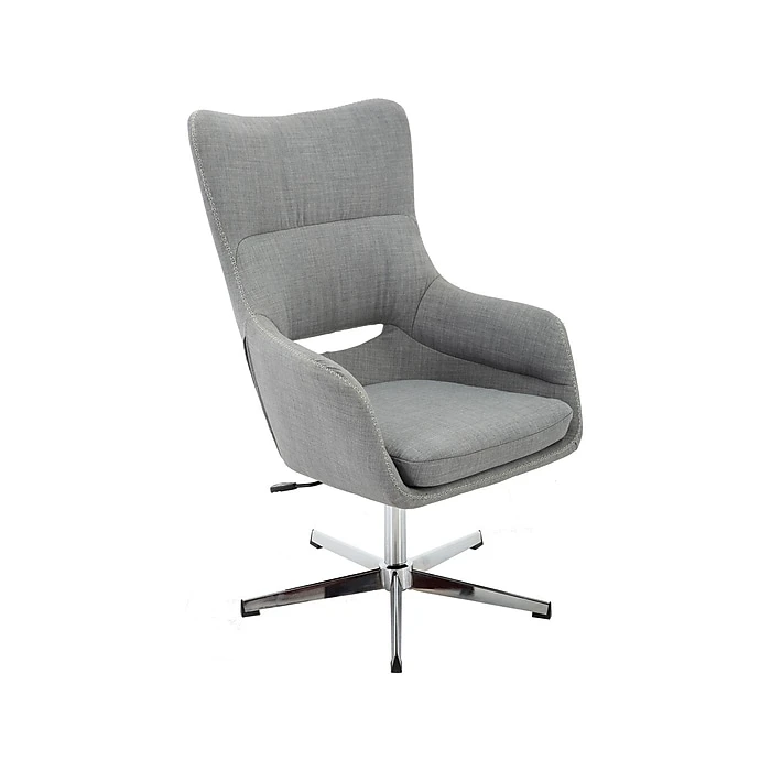 - Soft, gray polyester fabric wraps around the curved chair frame; the metallic chrome base stands securely in place