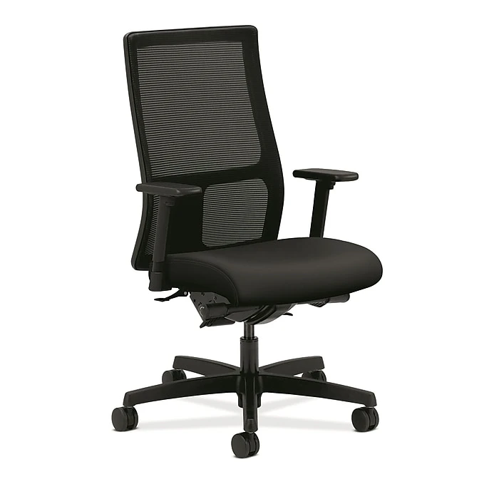Ignition seating from HON fits your body, your work and your space. This mesh mid-back chair with synchro-tilt and independent back angle offers an exceptional range of motion and is excellent for time-intensive activities. Its high recycled content reduces wood waste. Warranted for users up to 300 lbs. Height- and width-adjustable arms are standard for added comfort. Seat upholstery color is Black, and mesh, frame and base color is Black.