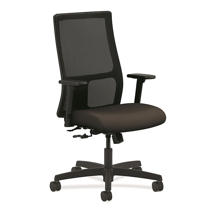 Ignition seating from HON fits your body, your work and your space. This mid-back chair with center-tilt features adjustments not often found in its category, and is excellent for time-intensive activities. Its high recycled content reduces wood waste. Warranted for users up to 300 lbs. Height- and width-adjustable arms are standard for added comfort. Seat and back upholstery color is Espresso, and frame and base color is Black.