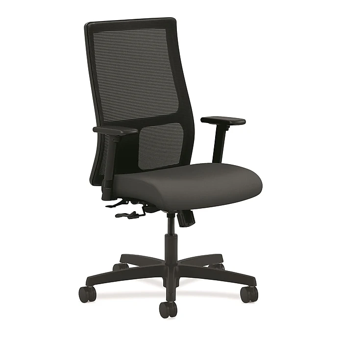 Ignition seating from HON fits your body, your work and your space. This mesh mid-back chair with center-tilt features adjustments not often found in its category, and is excellent for time-intensive activities. Its high recycled content reduces wood waste. Warranted for users up to 300 lbs. Height- and width-adjustable arms are standard for added comfort. Seat upholstery color is Iron Ore, and mesh, frame and base color is Black.