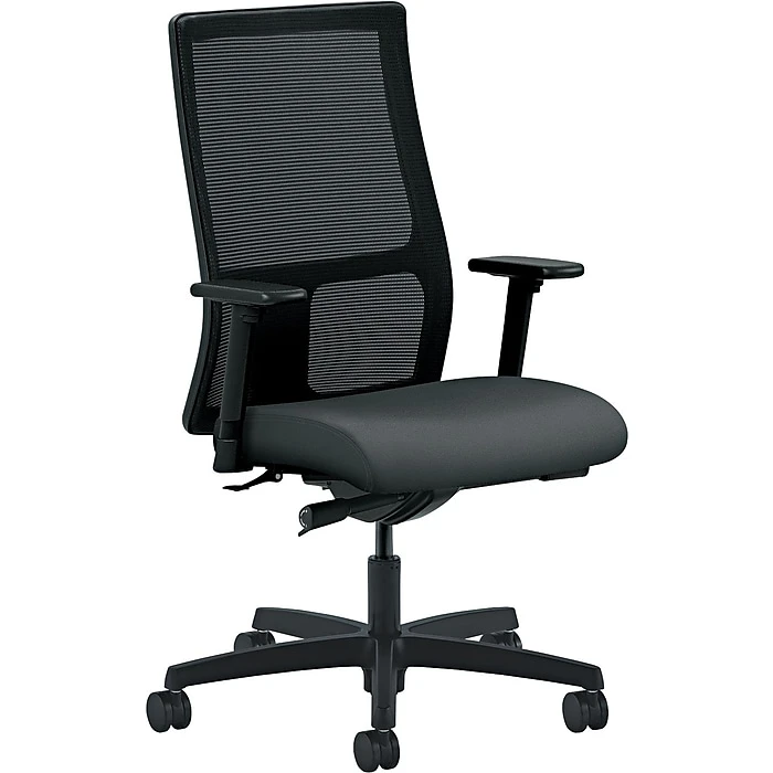 Ignition seating from HON fits your body, your work and your space. This mesh mid-back chair with synchro-tilt is a great blend of style and adjustability, and is excellent for time-intensive activities. Its high recycled content reduces wood waste. Warranted for users up to 300 lbs. Height- and width-adjustable arms are standard for added comfort. Seat upholstery color is Iron Ore, and mesh, frame and base color is Black.