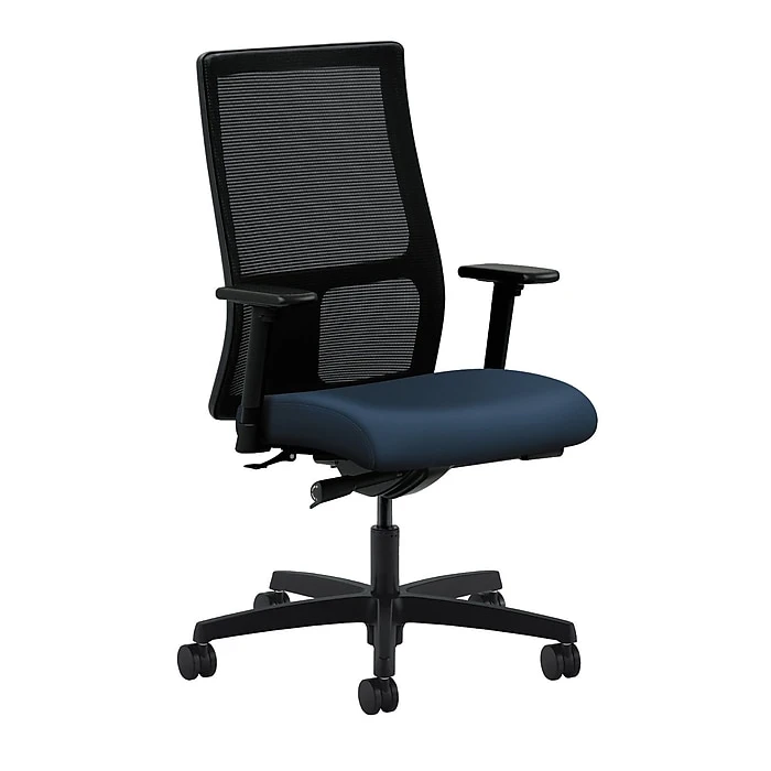Ignition seating from HON fits your body, your work and your space. This mesh mid-back chair with synchro-tilt is a great blend of style and adjustability, and is excellent for time-intensive activities. Its high recycled content reduces wood waste. Warranted for users up to 300 lbs. Height- and width-adjustable arms are standard for added comfort. Seat upholstery color is Ocean, and mesh, frame and base color is Black.