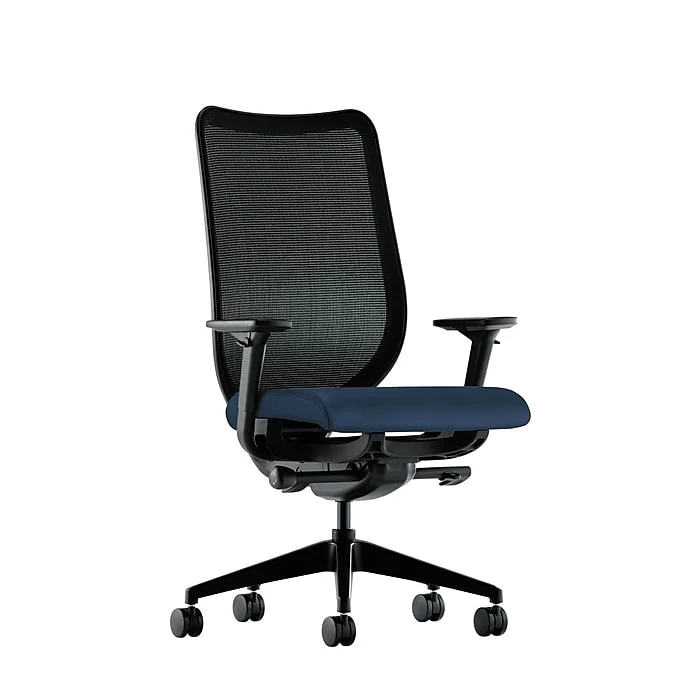 HON Nucleus seating is constructed from innovative materials to deliver comfort from the inside out.. This chair also features an ilira-stretch knit back that conforms to your spine. The synchro-tilt and four-position locking further promote proper back alignment. Height- and width-adjustable arms are standard for added comfort. Seat upholstery color is Ocean, back mesh color is Black, and frame and base color is Black.