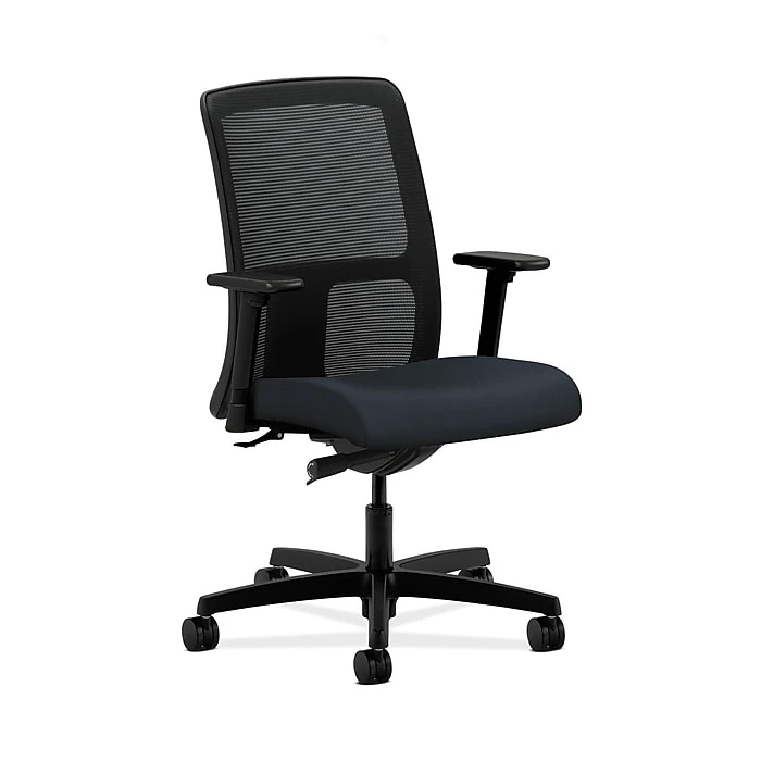 The Ignition low-back office chair from HON fits your body, your work and your space. This mesh chair with synchro-tilt is a great blend of style and functionality, and is excellent for time-intensive activities. Its high-recycled content reduces wood w aste. The chair can accommodate users up to 300 pounds, and the height and width-adjustable arms allow for added comfort.