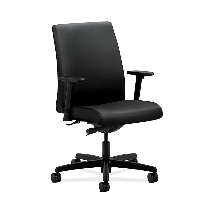 Ignition seating from HON fits your body, your work and your space. This low-back chair with synchro-tilt is a great blend of style and adjustability, and is excellent for time-intensive activities. Its high recycled content reduces wood waste. Warrante d for users up to 300 lbs. Height- and width-adjustable arms are standard for added comfort. Seat and back upholstery color is Black, and frame and base color is Black.