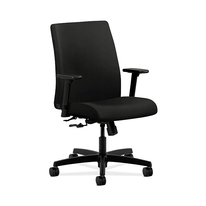 Ignition seating from HON fits your body, your work and your space. This low-back chair with center-tilt features adjustments not often found in its category, and is excellent for time-intensive activities. Its high recycled content reduces wood waste. Warranted for users up to 300 lbs. Height- and width-adjustable arms are standard for added comfort. Seat and back upholstery color is Black, and frame and base color is Black.