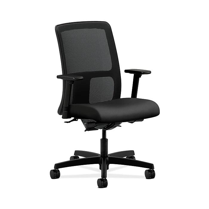 Ignition seating from HON fits your body, your work and your space. This mesh low-back chair with synchro-tilt and independent back angle offers an exceptional range of motion and is excellent for time-intensive activities. Its high recycled content red uces wood waste. Warranted for users up to 300 lbs. Height- and width-adjustable arms are standard for added comfort. Seat upholstery color is Onyx, and mesh, frame and base color is Black.