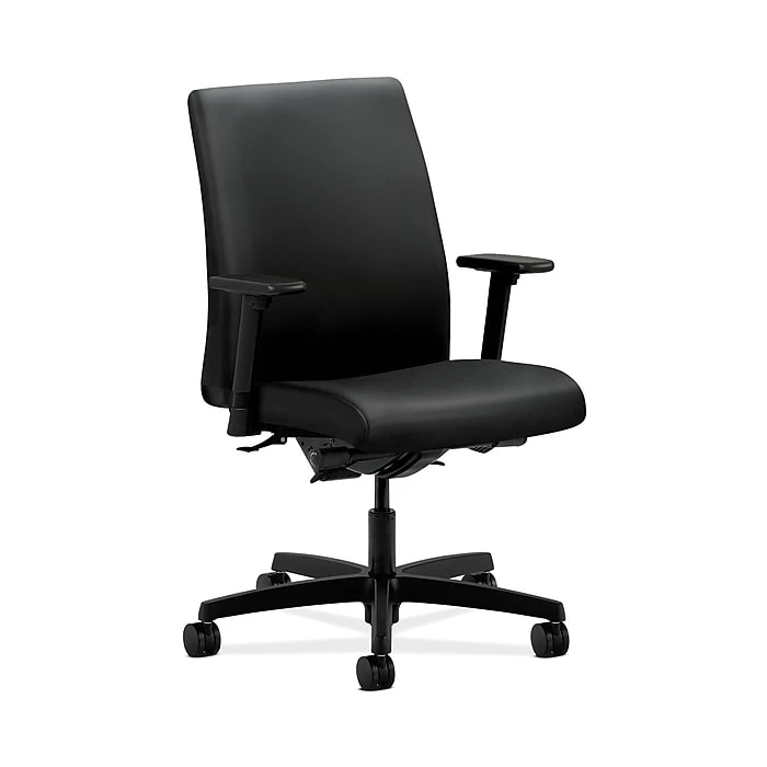 Ignition seating from HON fits your body, your work and your space. This low-back chair with synchro-tilt and independent back angle offers an exceptional range of motion and is excellent for time-intensive activities. Its high recycled content reduces wood waste. Warranted for users up to 300 lbs. Height- and width-adjustable arms are standard for added comfort. Seat and back upholstery color is Black, and frame and base color is Black.