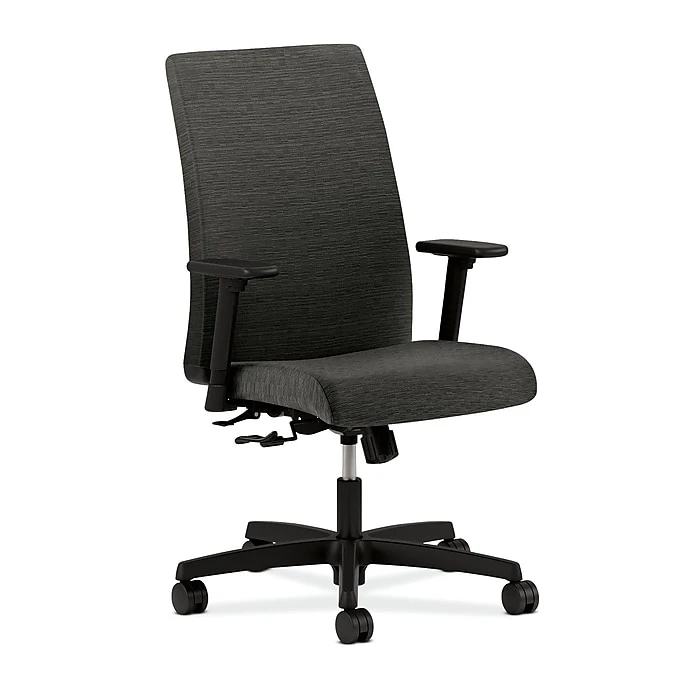 Ignition seating from HON fits your body, your work and your space. This mid-back chair with center-tilt features adjustments not often found in its category, and is excellent for time-intensive activities. Its high recycled content reduces wood waste. Warranted for users up to 300 lbs. Height- and width-adjustable arms are standard for added comfort. Seat and back upholstery color is Onyx, and frame and base color is Black.