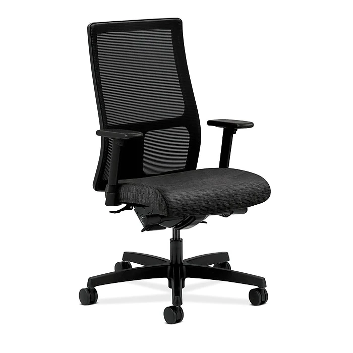 Ignition seating from HON fits your body, your work and your space. This mesh mid-back chair with synchro-tilt and independent back angle offers an exceptional range of motion and is excellent for time-intensive activities. Its high recycled content red uces wood waste. Height- and width-adjustable arms are standard for added comfort. This chair is warranted for users up to 300 pounds. The seat upholstery color is onyx and mesh, and the frame and base color is black.