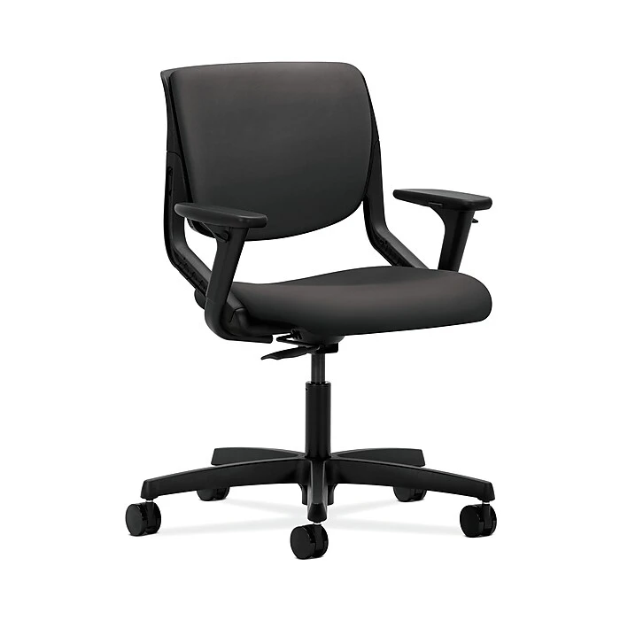 HON Motivate seating transforms any space into a dynamic environment. This task chair incorporates both great style and good ergonomics. The flex-back motion helps support the spine. Shell color is Onyx, back and seat upholstery color is Carbon, and bas e is Black.