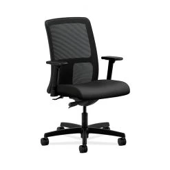 Ignition seating from HON fits your body, your work and your space. This mesh low-back chair with synchro-tilt is a great blend of style and adjustability, and is excellent for time-intensive activities. Its high recycled content reduces wood waste. War ranted for users up to 300 lbs. Height- and width-adjustable arms are standard for added comfort. Seat upholstery color is Onyx, and mesh, frame and base color is Black.