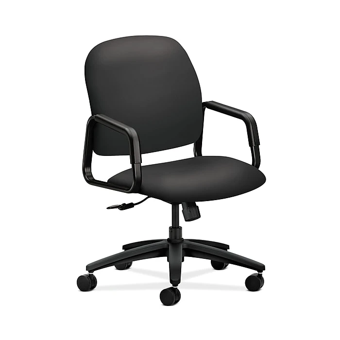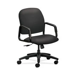 Everywhere you go, people rely on HON 4000 Series Solutions seating for dependability and comfort. This high-back chair features a floating backrest that gives your spine maximum support. The proven center-tilt mechanism allows you to comfortably reclin e, and fixed arms are integrated into the frame. The seat and back upholstery color is carbon, and the frame color is black.