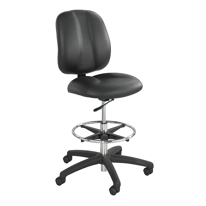 Comfortably attend to standing clients with this Safco Apprentice II extended height chair. With an ergonomically shaped back and built-in lumbar feature, this tall office chair provides comfortable support for your back. To further reduce fatigue, the seat cushion features a waterfall edge to improve circulation. The wrap-around footrest provides relief for your legs and facilitates frequent movement between standing and sitting. Easily change levels with the pneumatic seat height adjustments, and swiftly maneuver between tasks with a full 360 degrees of swivel. The wide base provides the extra stability and safety needed for a high chair. This Safco Apprentice II extended height chair has six casters for easy movement between workstations.