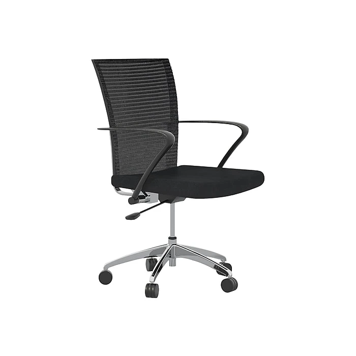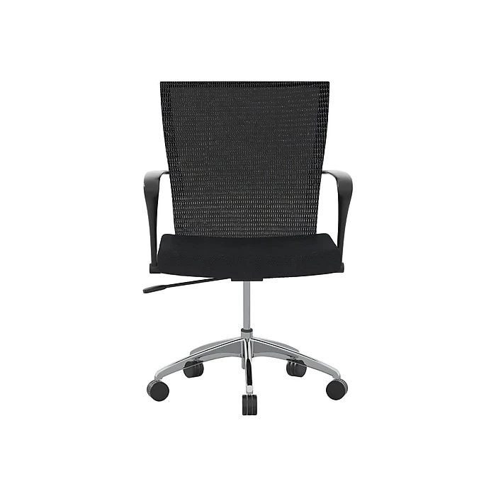 Valoré height adjustable task chair by Safco is remarkably comfortable for use in training or teaming spaces. At lowest setting arm height is 24.25″. Made of durable 5-star, 27″ aluminum base. Chair rotates a full 360 degrees in either direction for easy motion. Quick and easy adjustment regulates the height of the chair relative to the floor: the seat height is 18.5″ at its lowest point and 22.25″ at the highest. Pivot point located directly above the center of the chair base. Fixed L-shaped arms provide added comfort. Features dual wheel hard floor casters.