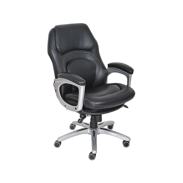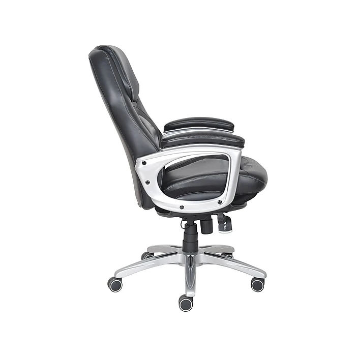 Enjoy the comfort of a seat primed for wellness with the Serta Wellness by Design Executive Office Chair. This innovative desk chair features Back in Motion Active Seating Technology, which corrects your posture by tilting your pelvis forward when you lean, keeping your spine in a neutral position. This ergonomic office chair helps you use proper body mechanics, reducing strain and stress while improving spinal health. It is designed with layered body pillows to provide optimal support and features heavy-duty 60-millimeter casters for smooth mobility.
