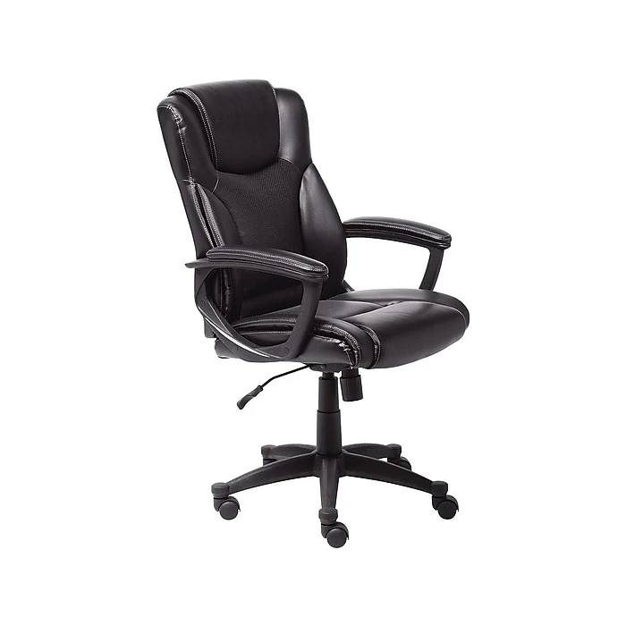 Adjust this supple black bonded leather executive office chair for optimal support while you work. The armrests are padded to provide comfort for forearms while helping reduce shoulder strain, and the waterfall cushion design helps promote blood circulation for long days at your desk. Thanks to the five dual-wheel casters, this chair makes rolling around your workstation smooth and simple, while the five-star base spreads out the weight for minimal impact on flooring. The upholstery is made with black leather to deliver a sophisticated, executive appearance. This Serta executive office chair features thick pillows and contoured lumbar support for your lower back, so sitting for extended periods of time is a comfortable experience.