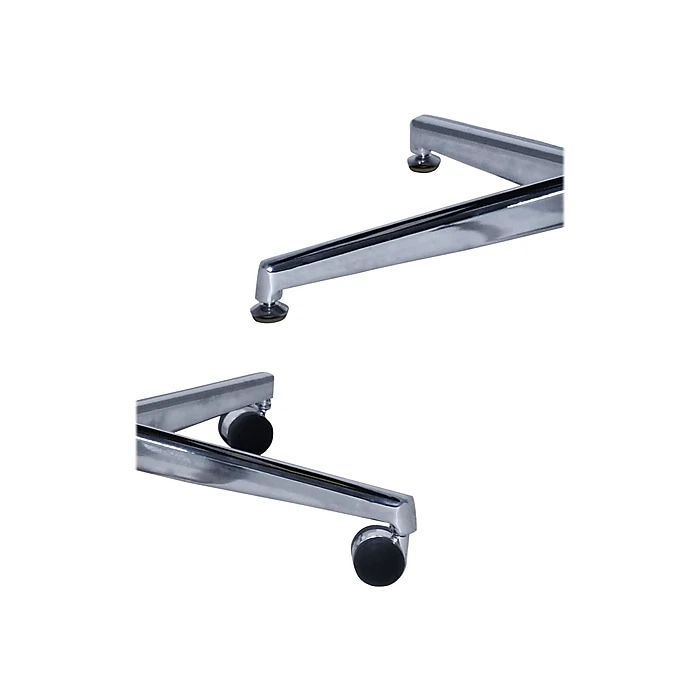 - Twill upholstery in blue; chrome-finished stainless steel base with casters offers 360-degree mobility