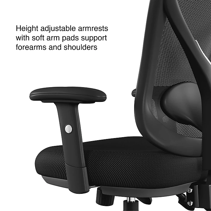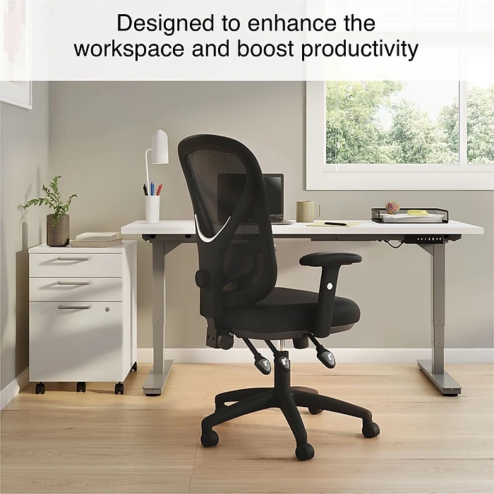 Sit back and tackle all your work projects in style with this sleek Carder mesh office chair. The modern design offers a quick update for your office, while the black color coordinates with a range of office decor styles. A mesh back allows air to circulate while you work, helping to keep you cooler throughout long workdays. The molded back features a slight curve that serves as lumbar support, while the adjustable seat and arms let you find the perfect configuration for your body. Featuring carpet casters and a stable five-star base, this Carder mesh office chair rolls easily over carpeted or tile floors.