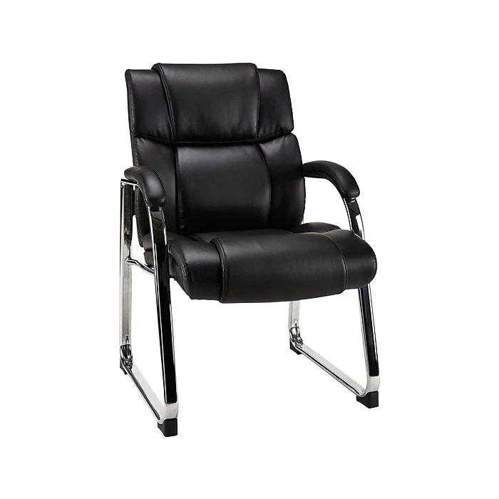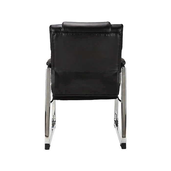 Create a warm, welcoming seating area for visitors to your building with this bonded leather guest chair. Contoured, segmented padding throughout the seat and seat back offer plush comfort, while the curved, padded armrests offer upper body support. This chair boasts bonded leather upholstery, providing both durability and sleek style. A sled-style base keeps this guest chair stable on a wide range of flooring surfaces, while the integrated floor glides prevent scratches and scuffs. With polished chrome accents and a sleek silhouette, this Sonada guest chair brings an upscale modern look to your private office, reception area, or lobby.