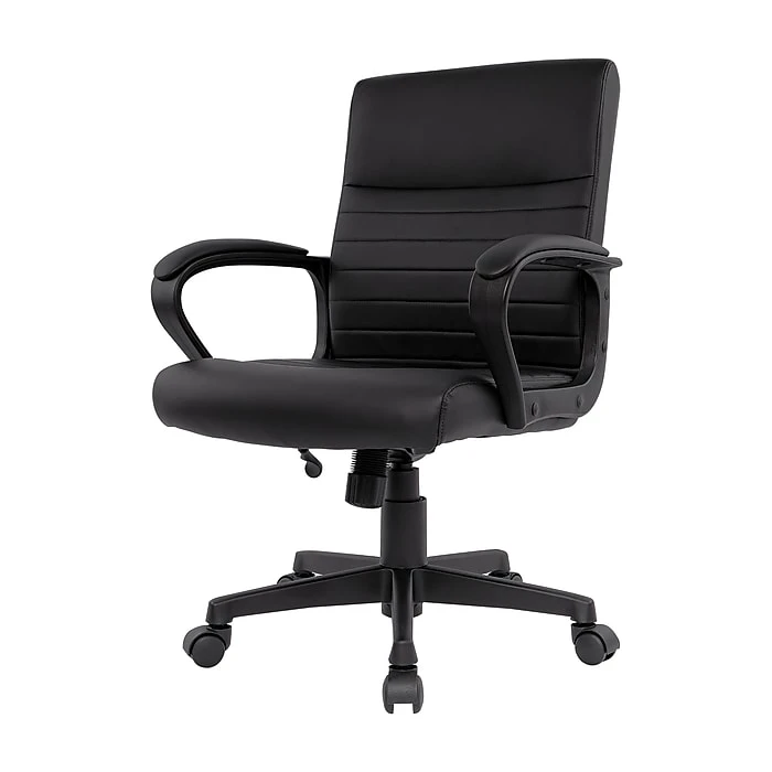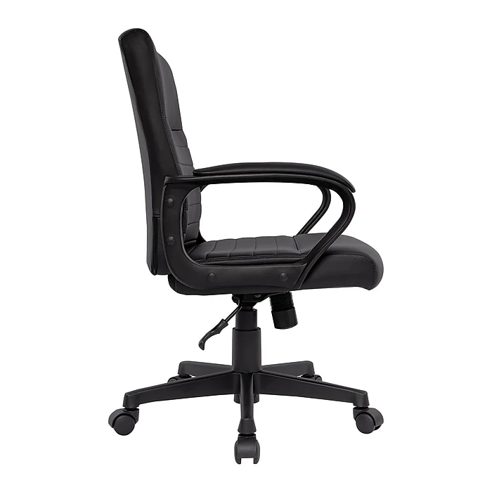 Stay comfortable while you work in this Tervinaâ„¢ black managers chair. Padded armrests provide added comfort, and built-in lumbar offers additional support. The soft upholstery looks and feels just like real leather for an elegant finishing touch. Use the pneumatic seat height adjustment and tilt tension to find then lock the perfect setup for your body.