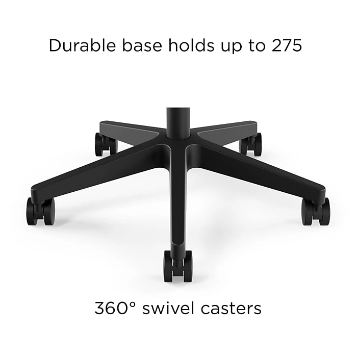 Maximize comfort while working on your daily deliverables with this black fabric chair. Five 360-degree casters let you move to and from the printer station freely, while the fabric upholstery withstands daily use. The contoured back and ample padding offer support during long workdays, while pneumatic height adjustment lets you find the optimal eye-to-screen position, promoting good posture. Configure the recline and tilt functions effortlessly with the built-in tilt tension knob, and unlock or lock your chair in an upright position using tilt lock. Fixed armrests accommodate your arms for additional support. This Essentials fabric chair features a premium framework that meets ANSI/BIFMA standards for reliable performance and lasting use.