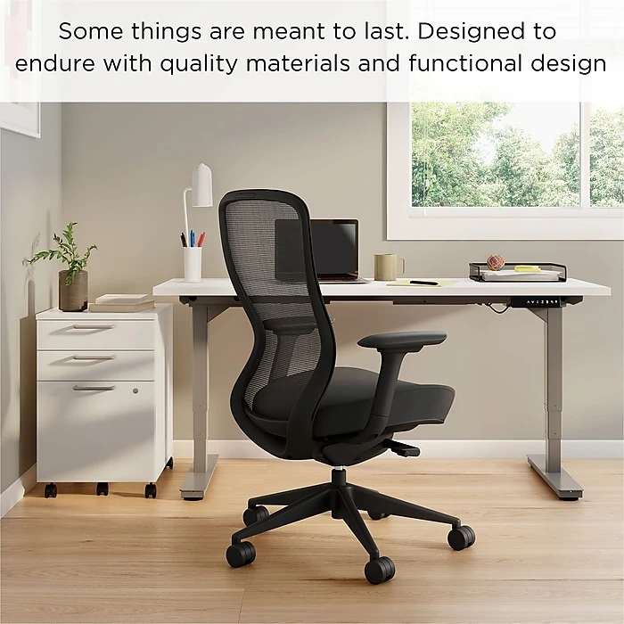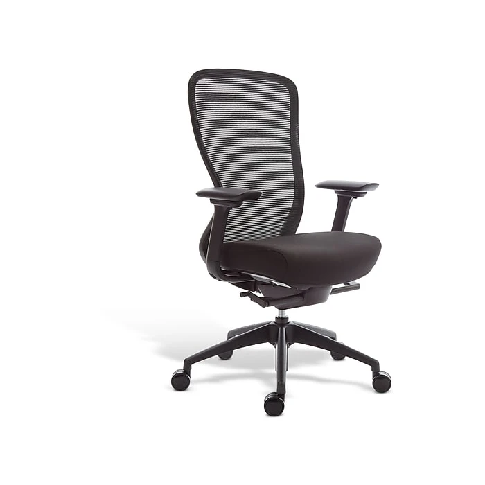 Complete reception areas or cubicle spaces with this sturdy mesh back fabric task chair. The adjustable seat height contributes to good posture and proper viewing angles, while the 3D armrests offer multiple positioning options, letting you rest your arms. Experience breathable comfort with the mesh back, and configure the reclining angle easily through the accessible tilt tension knob. A convenient tilt lock lets you fix the seat in various angled positions seamlessly, while the seat slide moves further or closer to the desk effortlessly. This Workplace2.0 Ayalon black mesh back fabric task chair meets ANSI/BIFMA standards for product safety and durability, creating a dependable seating solution to finish off your space.